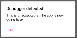 if에서 발생하는 루팅 & 디버깅 탐지 로직은 showDialog()를 통해서 처리된다. 코드를 보면 버튼이 화면에 출력되고 버튼을 클릭하면 System.exit(0)을 실행하는 순서다.