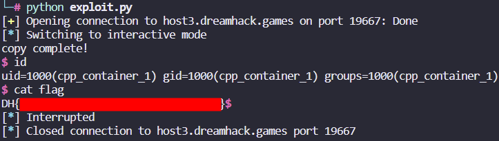 이때, 주의할 점은 src는 int 형이지만 입력을 string으로 받기 때문에 형변환을 고려해서 getshell 주소를 10진수로 변경한 문자열을 전송해야한다. 또한 int 형이므로 4바이트씩 저장되기 때문에 fp를 getshell 주소로 8바이트 형태의 getshell 주소로 저장하기 위해 getshell 주소와 0을 반복해서 저장했다. (0x0000000000401041 와 같이 8바이트 형태로 저장했다는 뜻이다.)
