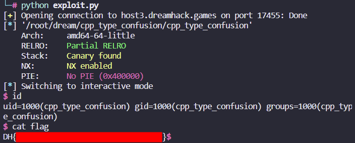 이처럼 형변환 과정에서 type confusion 취약점이 발생하면 의도치 않은 프로그램 동작을 유도하거나 메모리 커럽션을 발생시킬 수 있다. 따라서 type confusion이 발생하지 않도록 dynamic_cast를 사용하는 것이 좋다.