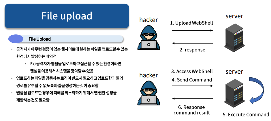웹 애플리케이션에서 사용자가 업로드한 파일을 처리하는 과정에서 발생할 수 있는 취약점으로 파일 업로드 기능이 존재하는 웹 사이트의 확장자 필터링이 미흡할 경우, 공격자가 악성 파일을 업로드하여 시스템을 장악할 수 있는 취약점이다.