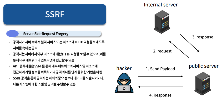 - 공격자는 서버에서 외부 리소스에 대한 HTTP 요청을 보낼 수 있으며, 이를 통해 내부 네트워크나 인트라넷에 접근할 수 있음