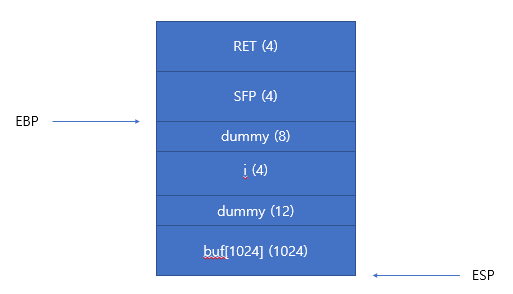 buf부터 i까지 1036 바이트, 이후 i(4 바이트)와 dummy(8 바이트), SFP(4 바이트)까지 합한 값이 RET까지의 거리이다.
