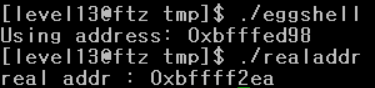 eggshell을 이용해서 환경변수에 셸코드를 적재했고 realaddr을 통해 주소를 구해보니 0xbffff2ea가 나왔다.