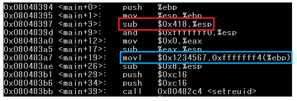 하늘색 박스를 보면 0x1234567을 ebp-12 주소에 옮기는 것을 확인 할 수 있다. (0xfffffff4는 -12를 의미한다.)