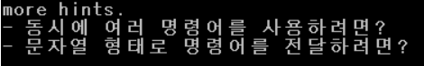 예를 들어 "ls" , "cat hint" 두 가지의 명령을 동시에 실행시키고 싶다면, "ls;cat hint"의 형태로 2가지의 명령을 동시에 실행하면 된다.