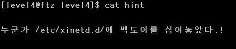 요약하자면, tcp 타입으로 연결하는 finger 서비스고 level5의 권한으로 /home/level4/tmp/backdoor 파일을 실행하여 해당 서비스를 수행한다.