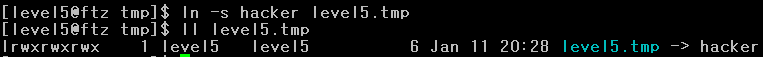 다음으로 hacker(원본파일)를 가리키는 level5.tmp(심볼릭링크 파일)을 생성한다.