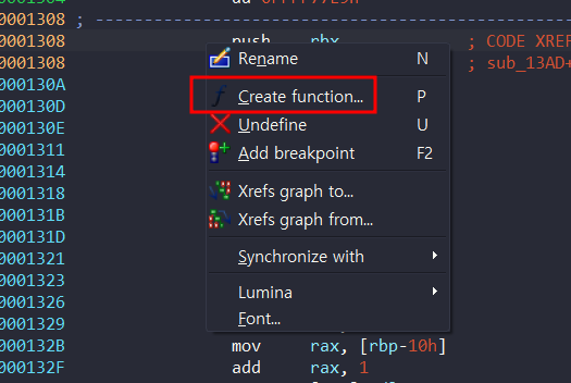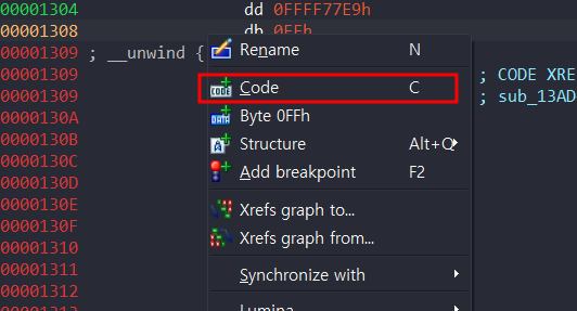 0x1308부터 코드가 재정의되도록 0x1308에 마우스 커서를 올리고 [오른쪽 마우스] → [Code] 순으로 클릭합니다.