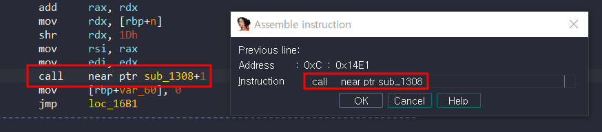 재생성한 함수는 sub_1308이므로 [Assemble instruction] 기능으로 호출 함수의 offset을 맞춰서 편집해줍니다.