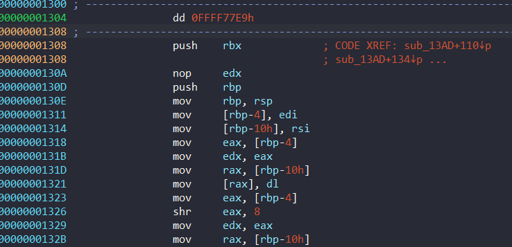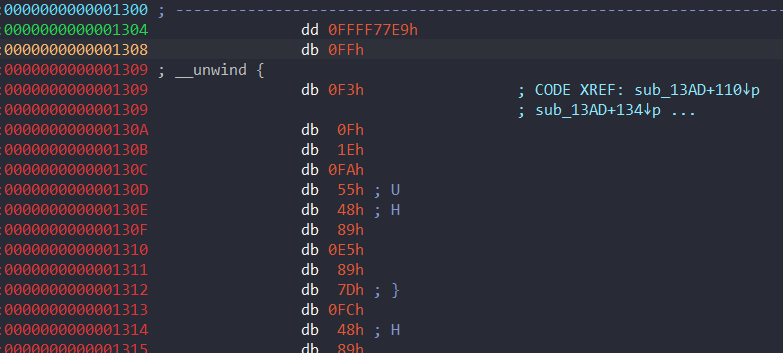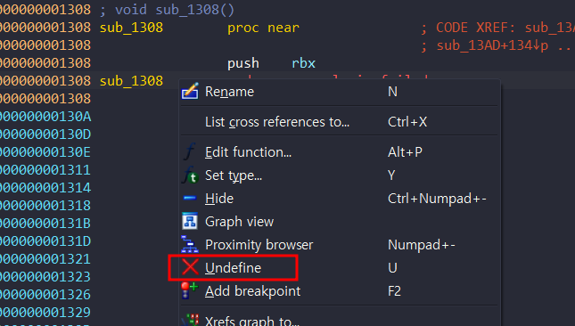 0x1308을 시작으로 asm 코드가 재정의된 것을 확인할 수 있습니다.