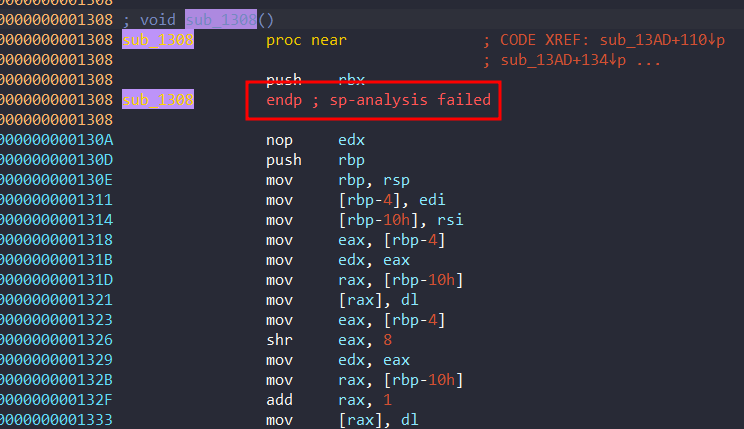 asm 코드를 보면 "endp ; sp-analysis failed"라는 오류가 발생하면서 디컴파일이 수행되지않습니다.
